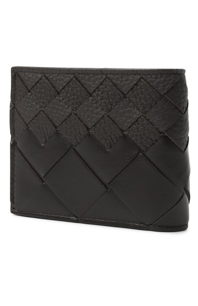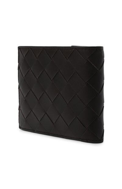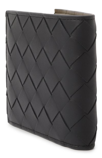 Портмоне выполнили в фирменной технике intrecciato из полос гладкой кожи. Внутри аксессуар с шестью карточными слотами украсили тисненым логотипом.