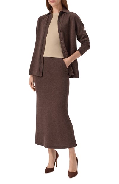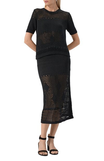 Миди-юбка в асимметричную полоску станет акцентной деталью в повседневном образе. Модель с эластичным поясом связали из пряжи на основе льна и хлопка.