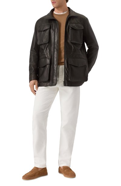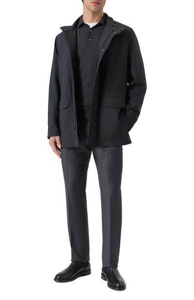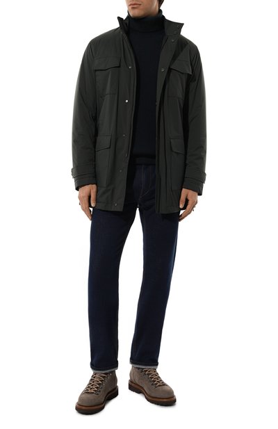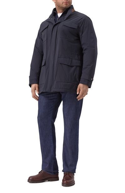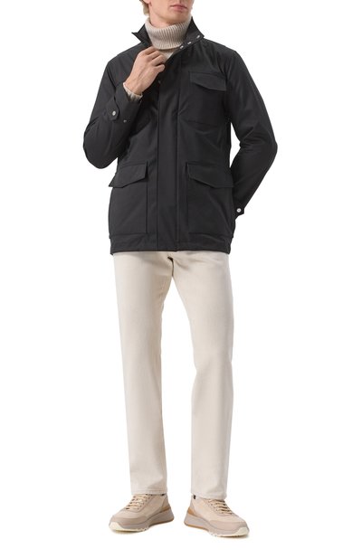 Куртку с воротником-стойкой и двумя шлицами сзади, утепленную наполнителем Thindown, дополнили четырьмя накладными карманами с клапанами. Модель с потайным поясом-кулиской, сшитая из ткани на основе полиэстера и шелка, застегивается молнией и штормовой планкой на кнопках.