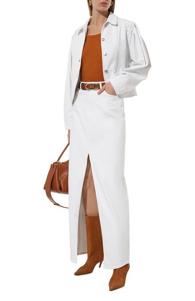 Сапоги Stiletto на обтянутой кожей шпильке выполнили из телячьей замши. Пара с зауженным мысом и прямым голенищем обходится без застежки.