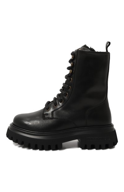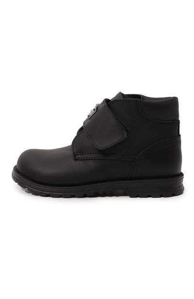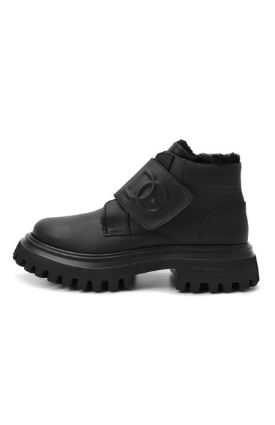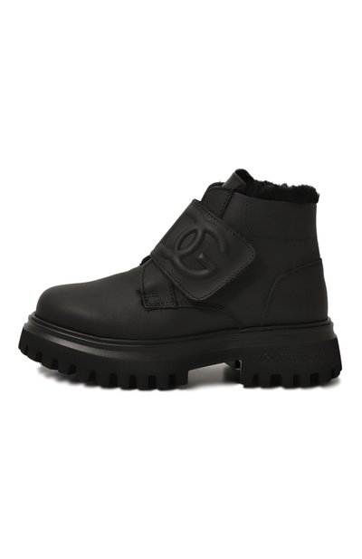 Ботинки на широкой протекторной подошве из полимера выполнили из матовой кожи, а для внутренней отделки изделия использовали овчину. Модель застегивается ремешком велкро с тисненой монограммой DG.
