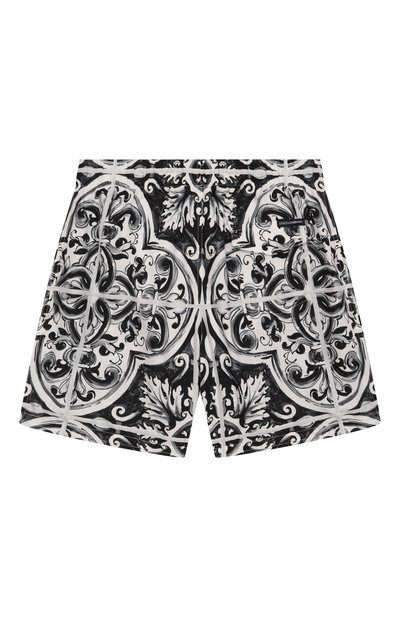 Плавки с брендированным шнуром, продетым в пояс-кулиску, выполнили из полиэстера с монохромным принтом Majolica. Один из трех карманов украсили фирменной нашивкой.