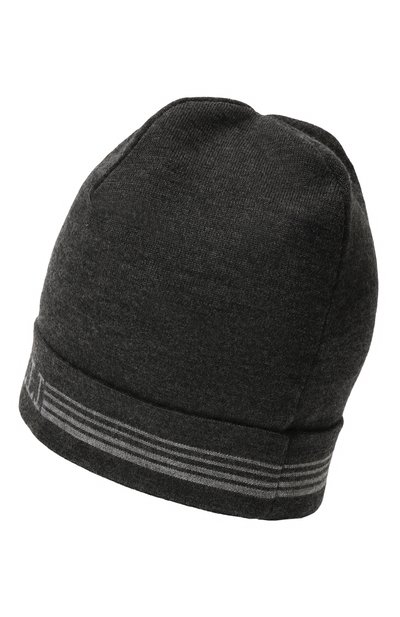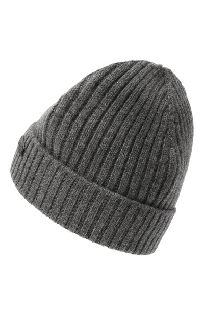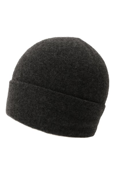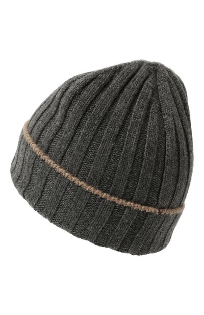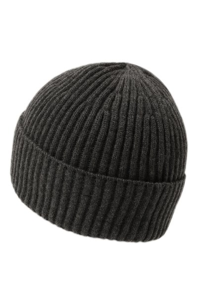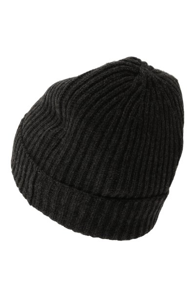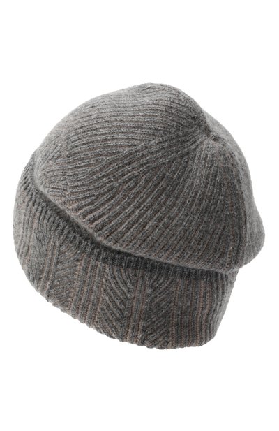 Рифленую шапку бини выполнили из твидового кашемирового трикотажа. Широкий отворот модели украсили контрастным узким кантом.