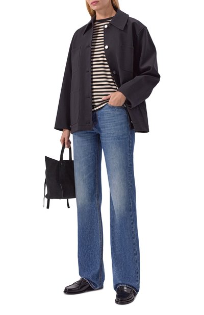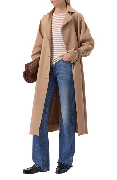 Пуловер в полоску выполнен из хлопкового трикотажа с добавлением кашемира и лиоцелла. Модель с круглым вырезом, манжетами и поясом в рубчик может стать основой повседневного образа.