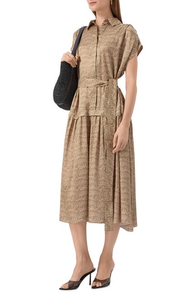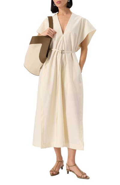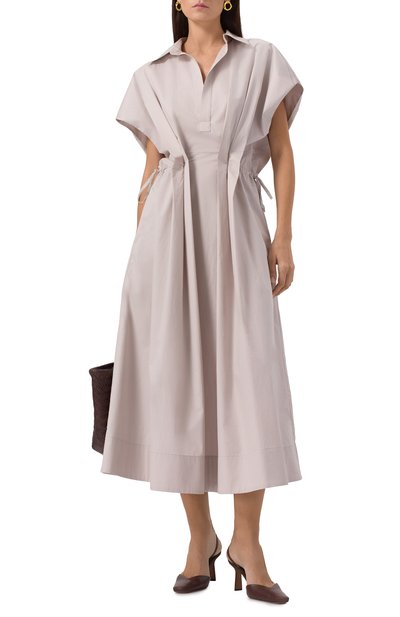 Платье с расклешенным подолом и двумя боковыми карманами выполнили из микса хлопка и шелка. Модель застегивается укороченной планкой с пуговицами в тон.