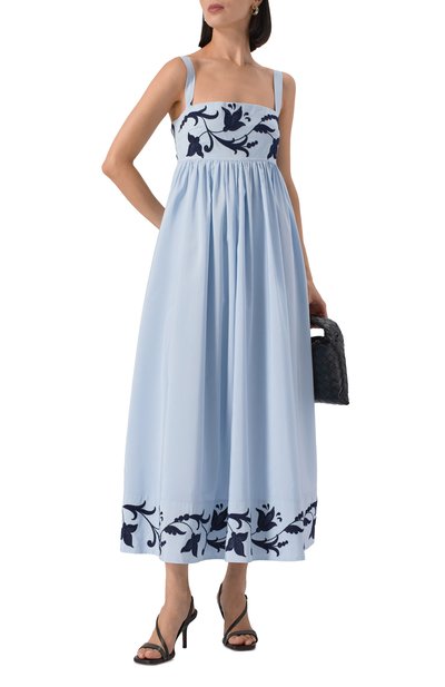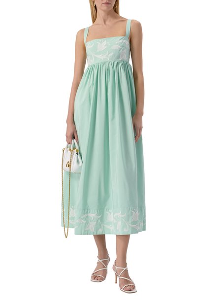Для пошива миди-платья с завышенной линией талии и двумя боковыми карманами использовали смесь хлопка и шелка. Модель с контрастной цветочной вышивкой на лифе и по краям подола застегивается потайной молнией сзади.