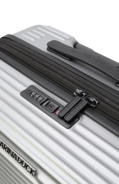 Чемодан Bank Zip с телескопической и двумя фиксированны ми кожаными ручками выполнили из поликарбоната. Верхние углы изделия усилили при помощи накладок. Модель с тремя внутренними отсеками на молниях и отделением с прижимными ремнями закрывается молнией, замком TSA и эластичным съемным ремнем с фирменным замком-бабочкой.