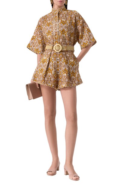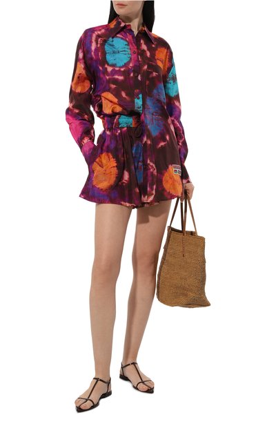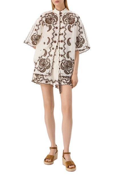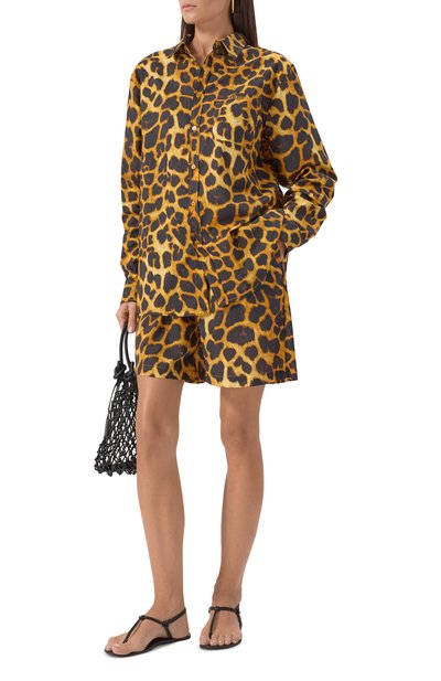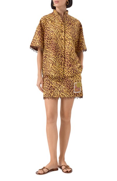 Мини-юбку с двумя боковыми карманами и потайной молнией сзади выполнили из хлопка с леопардовым узором. Спереди модель украсили брендированной нашивкой, а края подчеркнули бахромой из бусин.