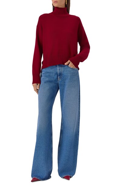 Свитер связали гладью из кашемировой пряжи. Сбоку модель с рифлеными поясом, удлиненными манжетами и высокой горловиной украсили небольшой брендированной пластиной.