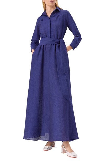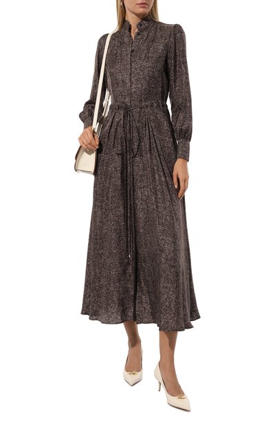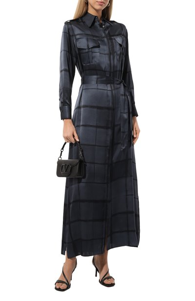 Платье-рубашку с высокими боковыми разрезами и супатной застежкой выполнили из шелка с графичным узором. Модель дополнили двумя парами карманов и съемным поясом-лентой.