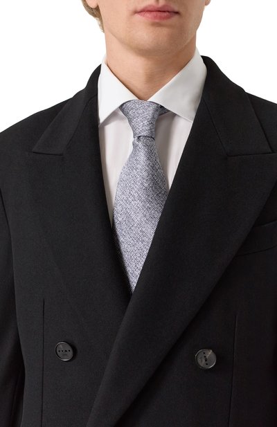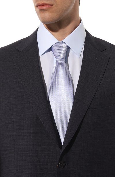 Галстук с геометрическим узором выполнили вручную из шелкового жаккарда по технологии seven fold. Модель органично дополнит офисный образ.