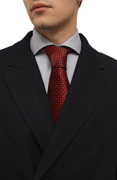 Галстук с геометрическим жаккардовым узором создаст акцент в офисном образе, не выводя его за рамки формального дресс-кода. Аксессуар средней ширины выполнили из шелка по технологии seven fold.