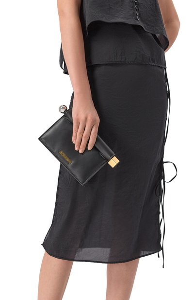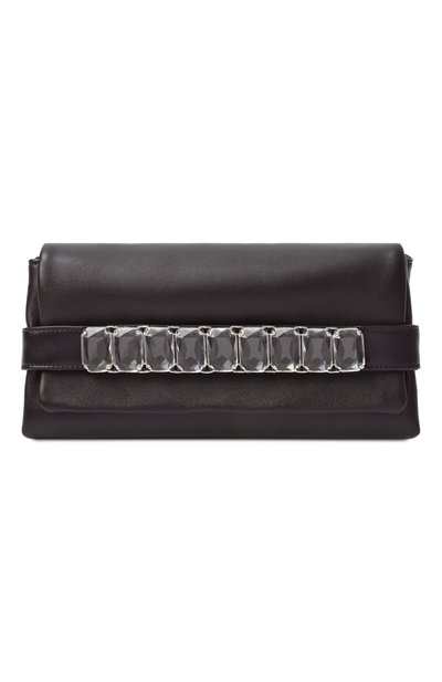 Клатч Kya с плечевым ремнем-цепочкой и внутренним плоским карманом выполнили из наппы. Откидной клапан изделия фиксируется перемычкой с кристаллами, которая играет роль ручки.