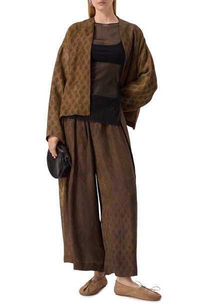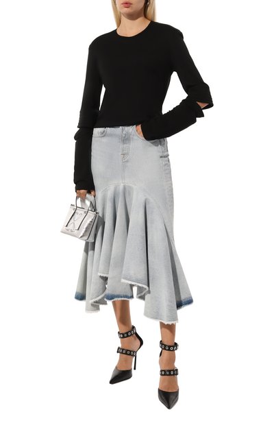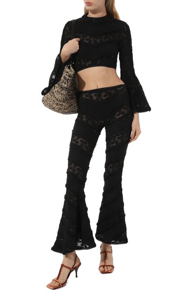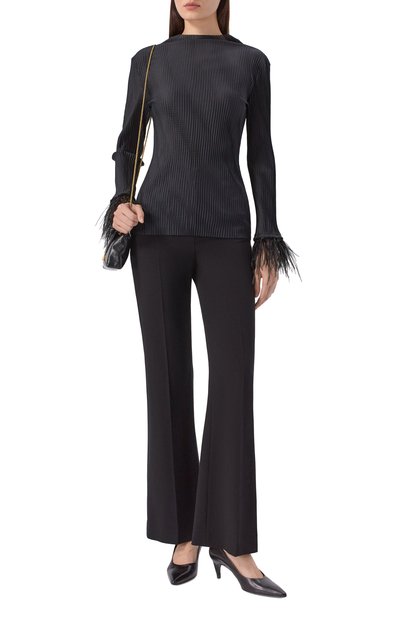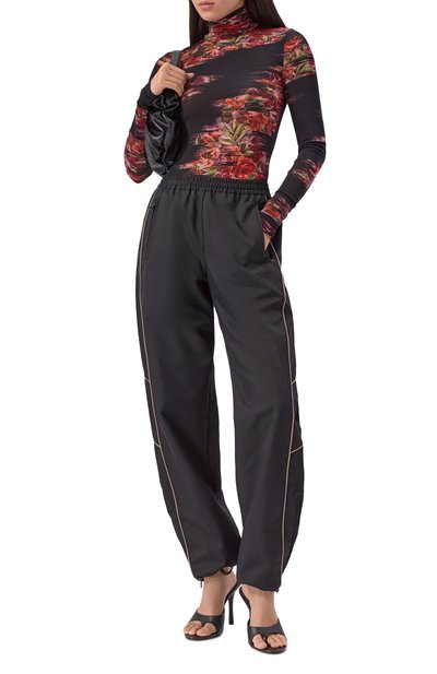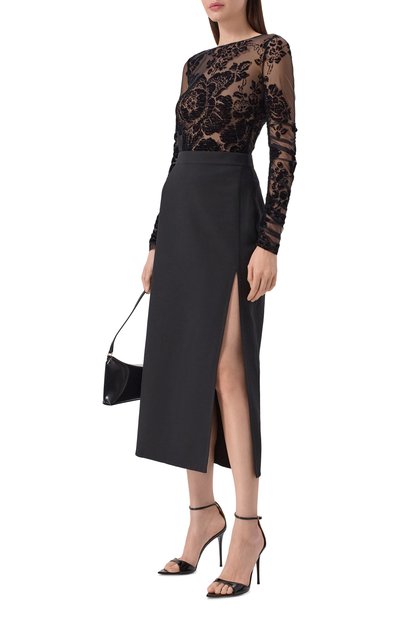 Топ с вышивкой на груди выполнили из полупрозрачного тюля с брендированным цветочным принтом. Низ и манжеты облегающей модели с круглым вырезом сделали волнистыми.