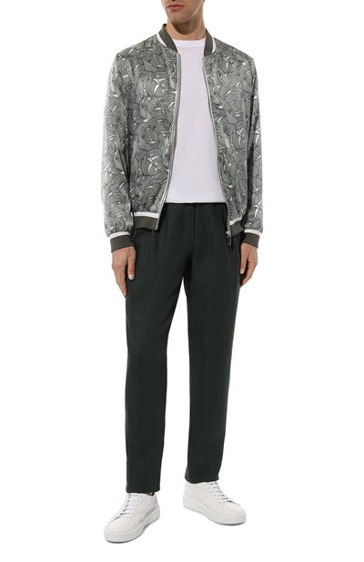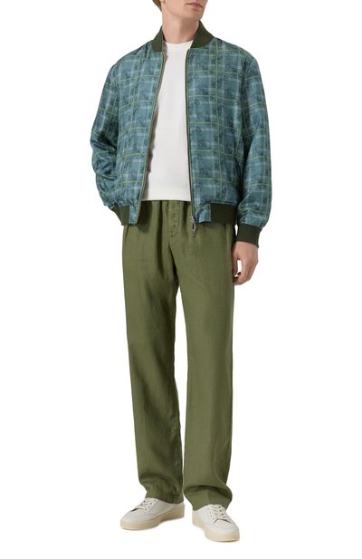 Для изготовления двубортного бомбера использовали шелковый атлас, а для высокого ворота, пояса и манжет — трикотаж в рубчик. Куртку, застегивающуюся встречной молнией, можно носить наружу стороной с графичным узором или однотонной.