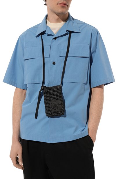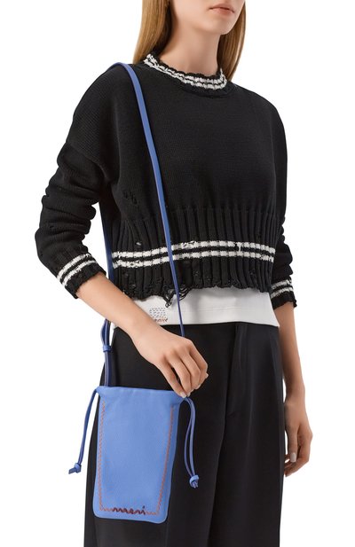 Сумку BC Duo с плечевым ремнем изготовили из телячьей кожи. Модель с логотипом на передней панели дополнили расшитыми цепочками мониль петлями по бокам.