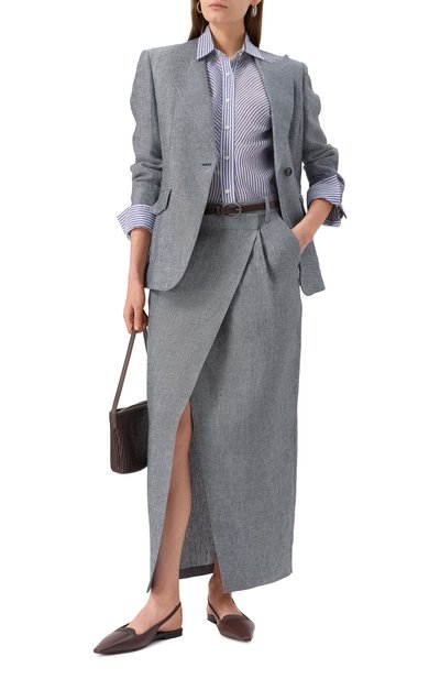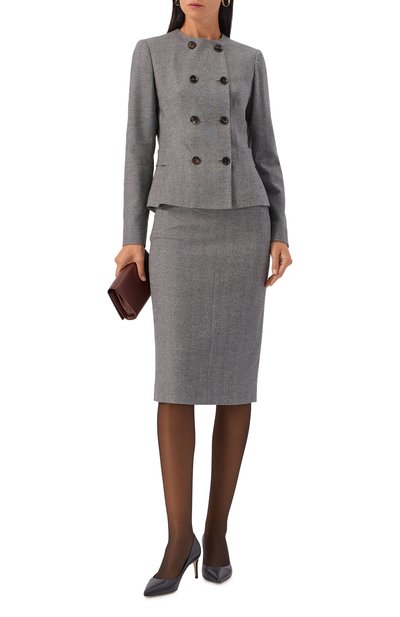 Юбку-карандаш со шлицей сзади и потайной молнией спереди дополнили четырьмя карманами. Модель с отворотом снизу и отглаженными стрелками изготовили из костюмной шерсти в клетку гленчек.