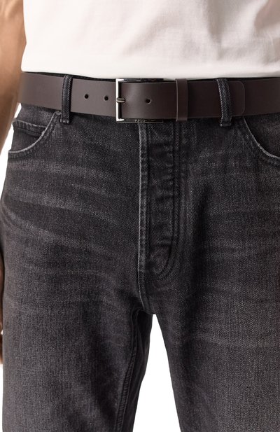 Для изготовления ремня стандартной ширины использовали спилок из кожи буйвола. Аксессуар с тренчиком в тон застегивается патинированной пряжкой с рельефным логотипом марки.