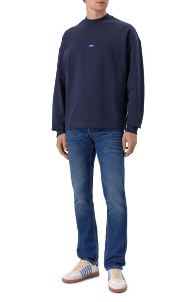 Выбеленные джинсы с разрывами и потертостями изготовили из жесткого денима. Шлевку сзади, пояс и один из трех передних карманов украсили брендированными нашивками, а пару задних — вышитыми изображениями чайки.