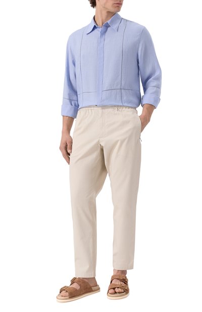 Рубашку с фигурным низом и закругленными манжетами сшили из льняной ткани, произведенной на мануфактуре Albini. Модель гармонично впишется в летний базовый гардероб.