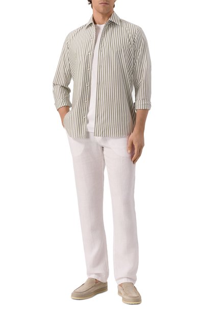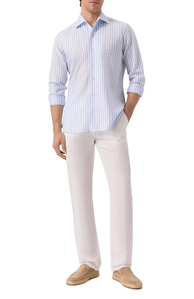 Для пошива рубашки в вертикальную полоску использовали микс хлопка и льна. Модель с закругленными манжетами и низом сможет стать основой нестрогого образа.