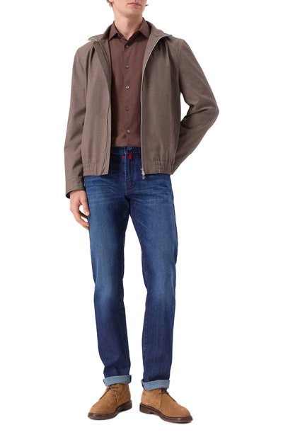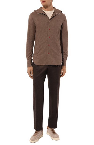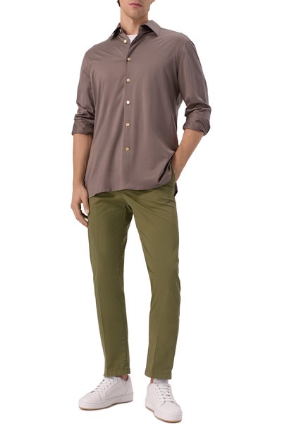 Рубашку кроя Slim fit сшили из льняного джерси, произведенного на старинной итальянской фабрике Albini. Модель, как и закругленные манжеты, застегивается перламутровыми пуговицами в тон.