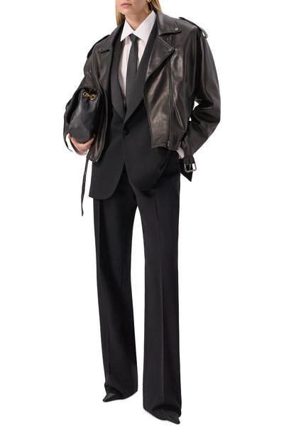 Для создания брюк с широкими отворотами выбрали креп Couture на основе шерсти первого пострига и шелка. Помимо боковых карманов у модели со стрелками предусмотрели задние на обтяжных пуговицах.