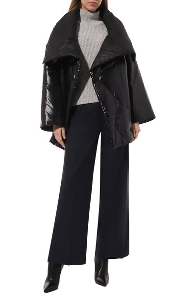 Расклешенные брюки с высокой посадкой выполнили из тонкой шерстяной ткани. Модель со шлевками для ремня дополнили боковыми карманами и накладными задними.