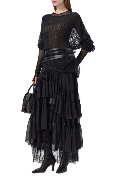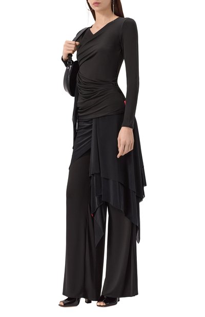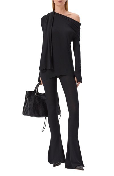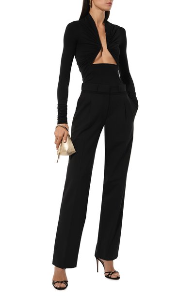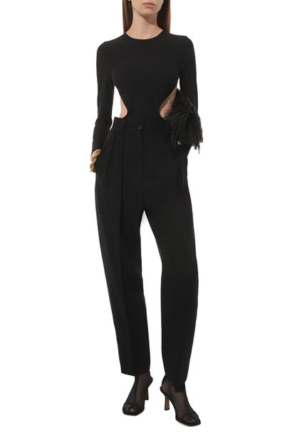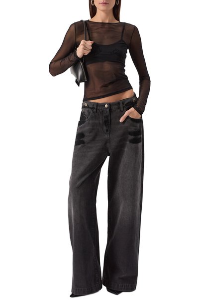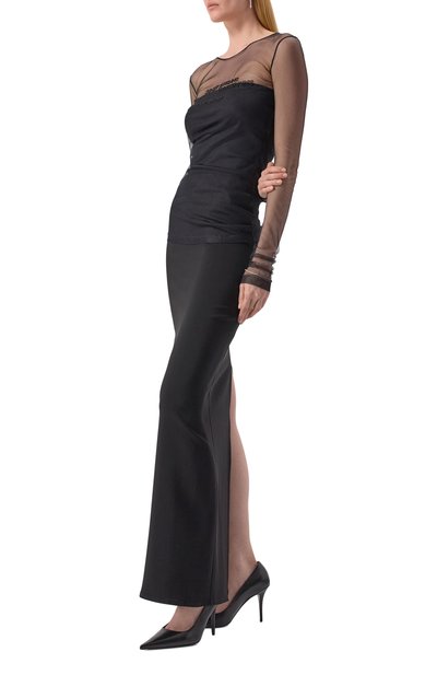 Полупрозрачный облегающий топ с круглым вырезом и длинными рукавами выполнили из стрейчевого тюля. Спереди модель украсили крупным логотипом, вышитым миниатюрными пайетками.