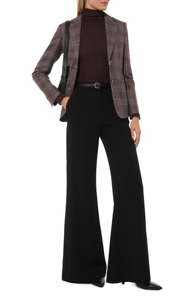 Меланжевую водолазку в фактурную полоску выполнили из трикотажа на основе кашемира, шерсти и шелка. Модель органично дополнит базовый гардероб.