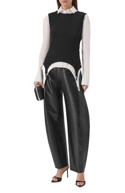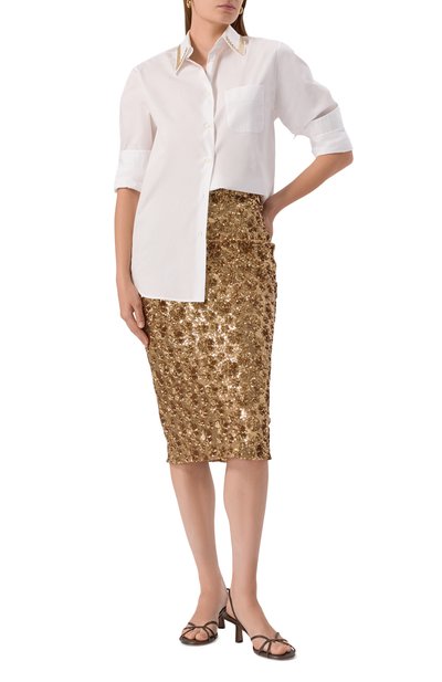 Oversize-рубашку с фигурным низом выполнили из хлопкового поплина. Модель с прямоугольными манжетами и кокеткой на спинке застегивается пуговицами в тон.