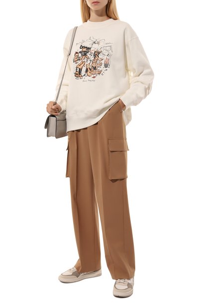 Широкие брюки в тонкую вертикальную полоску выполнили из костюмной ткани на основе полиэстера и вискозы. Модель с глубокими встречными складками и имитацией прорезных карманов спереди декорировали серебристым рельефным логотипом.