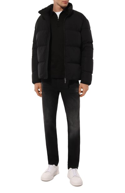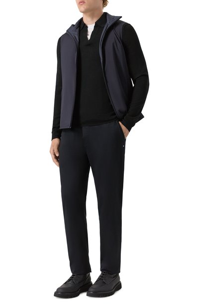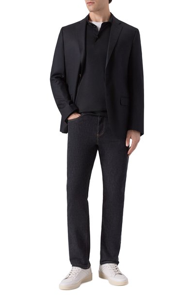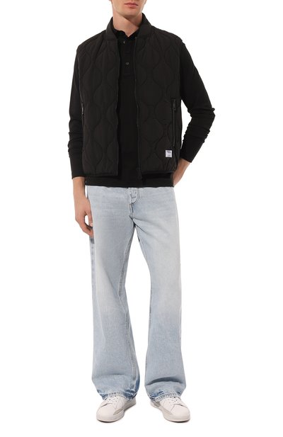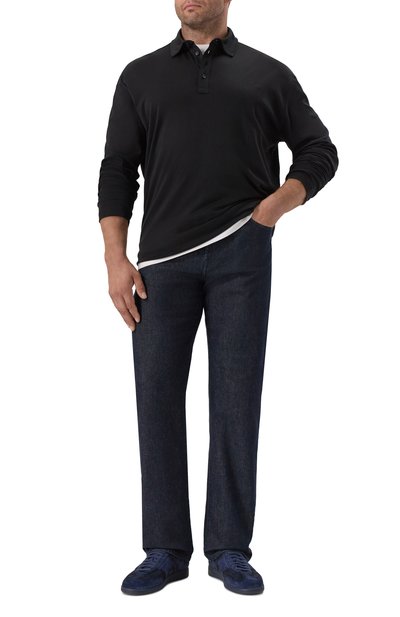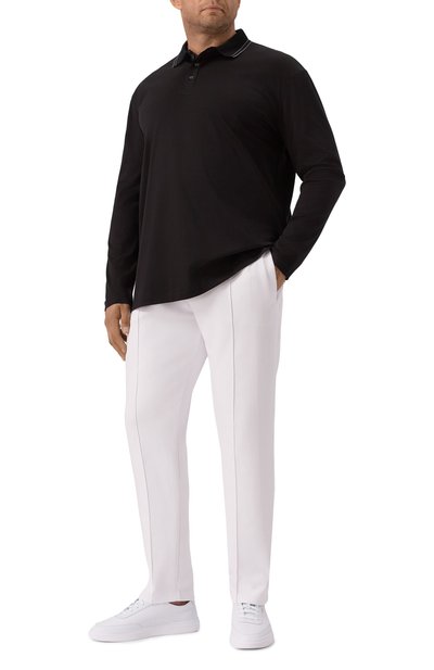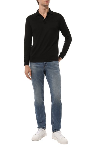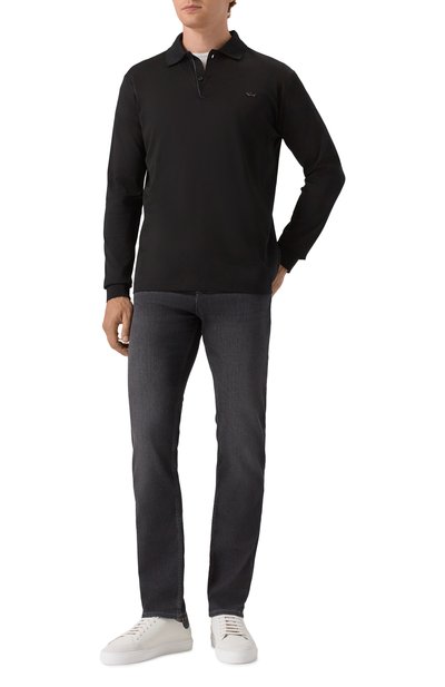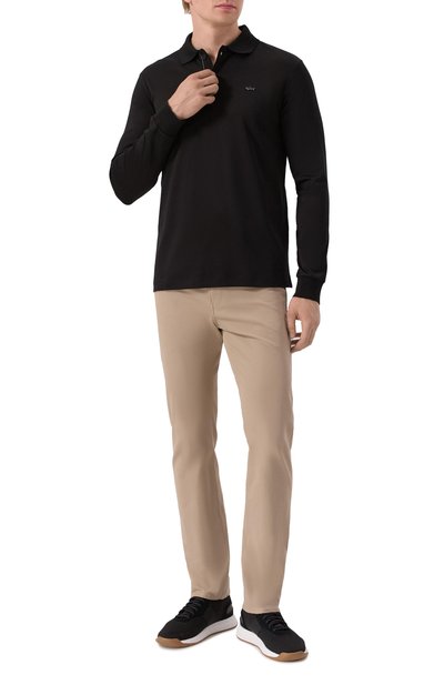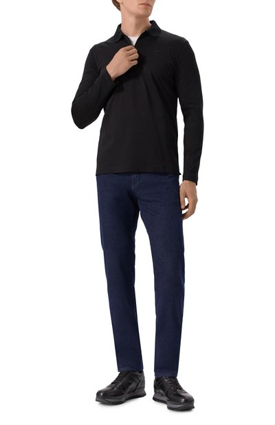 Поло с фактурным кантом на отложном воротнике выполнили из хлопкового трикотажа. Модель, застегивающуюся молнией, украсили миниатюрной эмблемой, вышитой нитями в тон.