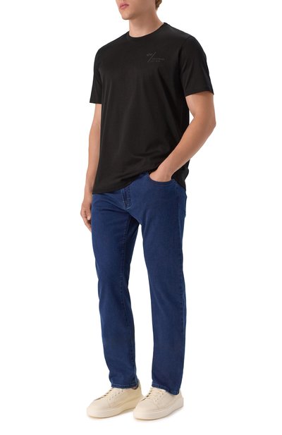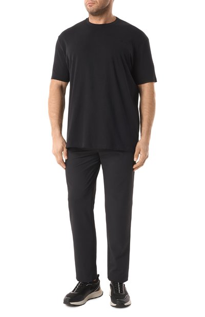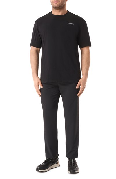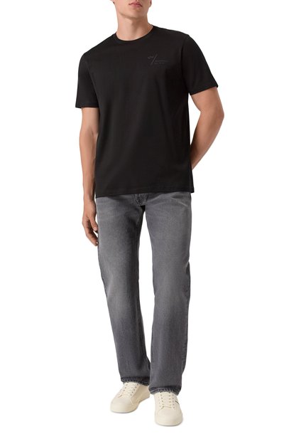 Футболку со слегка спущенной линией плеч выполнили из хлопкового джерси. Модель украсили вышитым в тон логотипом спереди и фирменным акульим плавником под горловиной сзади.