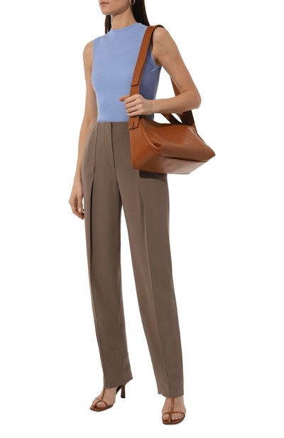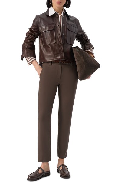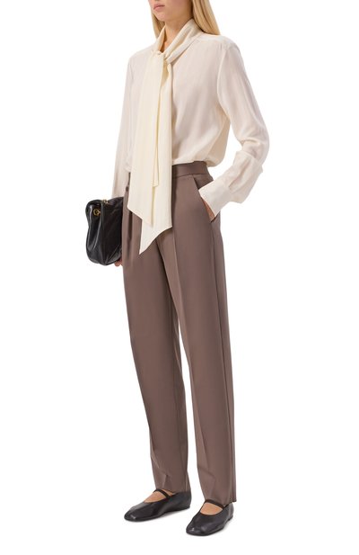 Укороченные брюки с защипами и стрелками сшили из хлопкового трикотажа. Модель с эластичной вставкой на поясе дополнена четырьмя карманами. Наши стилисты предлагают составить total look c парной толстовкой.