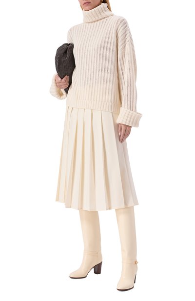 Свитер с трехмерным ажурным узором связали из кашемира Feather. Модель со спущенной линией плеч и круглой горловиной дополнили отделкой в рубчик.