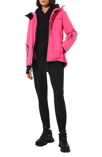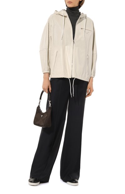 Ветровку с кулисками на капюшоне и по низу выполнили из полиэстера с добавлением полиуретана. Спереди модель с двумя боковыми карманами украсили геральдической нашивкой с эмблемой Solomeo, а встречную молнию подчеркнули каймой из фирменных цепочек мониль.