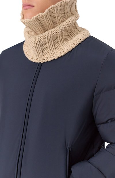 Шарф-снуд с внешними рельефными швами изготовили из шерсти с добавлением нейлона и эластана. Асимметричную кайму по краям выполнили в рубчик.