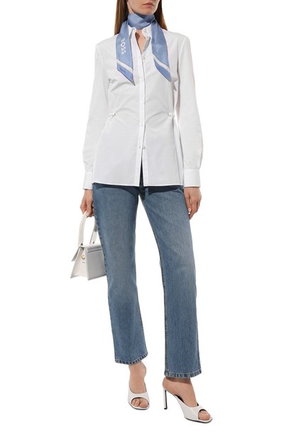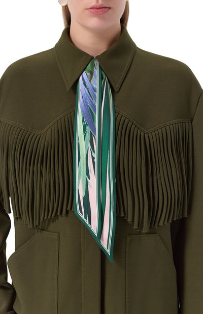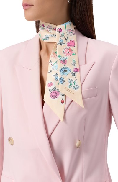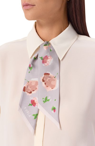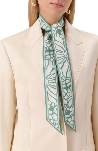 Шарф-твилли декорировали с одной стороны цветочным мотивом, а с другой – паттерном из эмблемы марки. Для изготовления аксессуара со скошенными концами использовали шелковый твил.