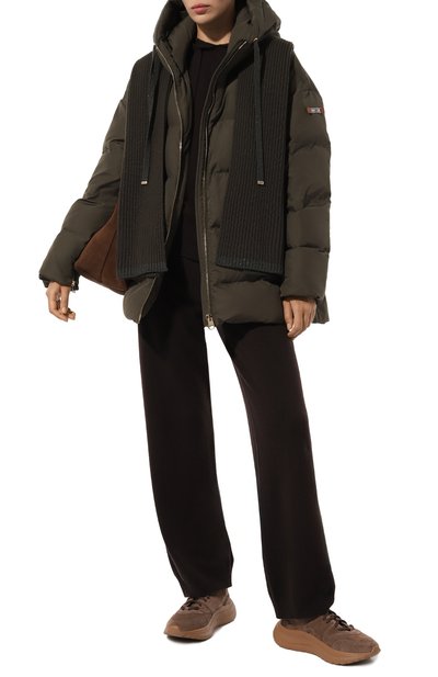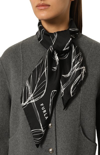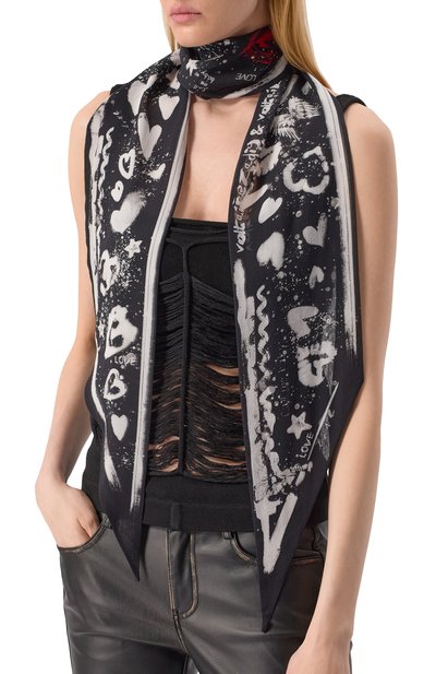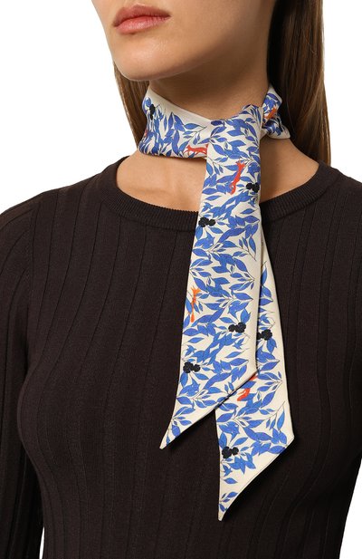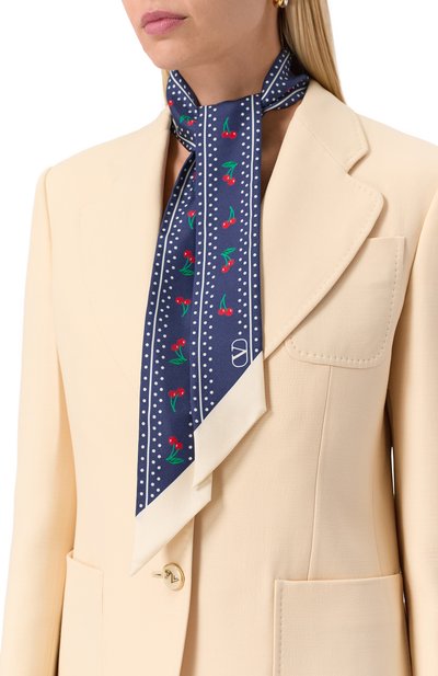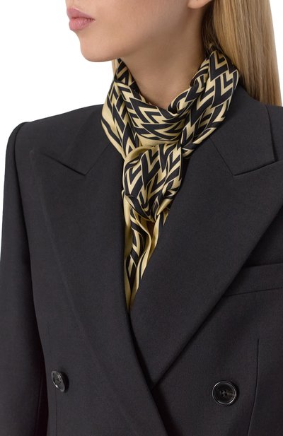 Шарф из шелкового твила украсили контрастным принтом с фирменной эмблемой. По краям аксессуара создали полосатую рамку.