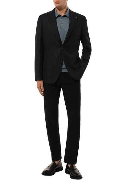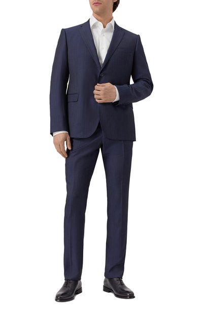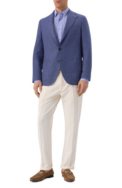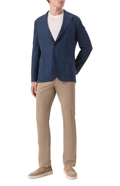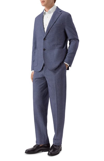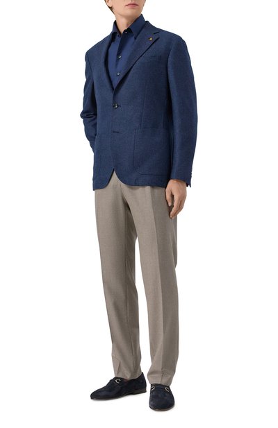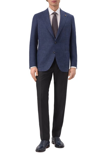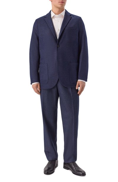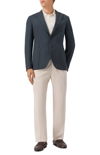 Однобортный пиджак с полуподкладом и двумя шлицами сзади выполнили из стрейчевой костюмной шерсти. Модель с прямоугольными лацканами дополнили нагрудным прорезным и парой накладных карманов.