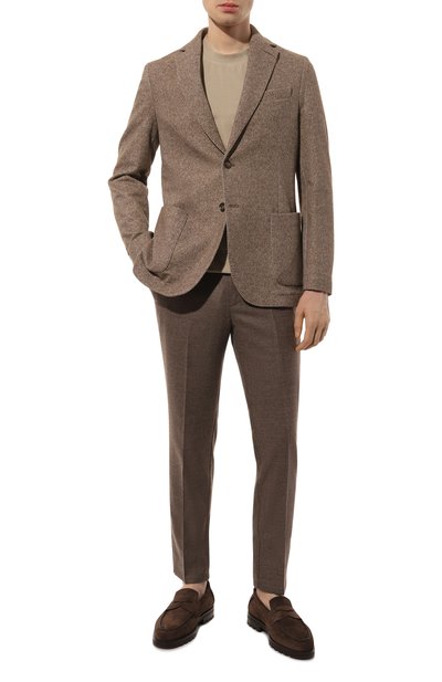Для пошива брюк с широким эластичным поясом-кулиской использовали шерстяную фланель. Модель прямого кроя дополнили двумя парами врезных карманов.