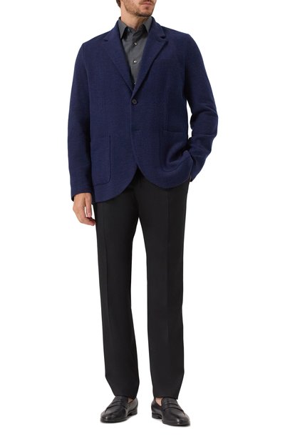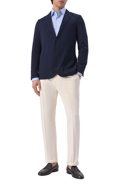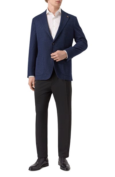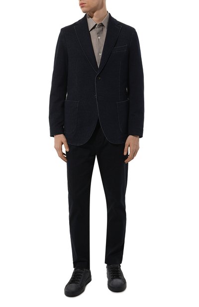 Однобортный пиджак с тремя врезными карманами сшит из хлопкового бархата с добавлением полиэстера. Приталенная модель с широкими лацканами и парой шлиц застегивается пуговицей.