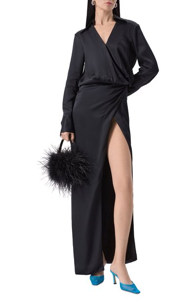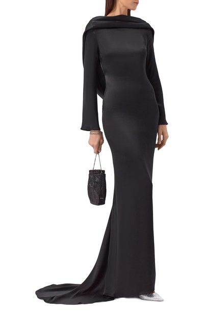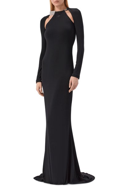 Облегающее миди-платье с потайной молнией на спинке выполнили из вискозного трикотажа с добавлением полиэстера. Глубокое декольте с фестончатыми краями отделали полупрозрачным кружевом с растительным мотивом.