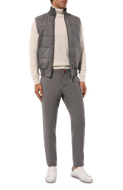 Брюки с глубокими складками под эластичным поясом и защипами на манжетах дополнили боковыми и задними прорезными карманами. Модель из кашемирового трикотажа застегивается потайной молнией и пуговицей.
