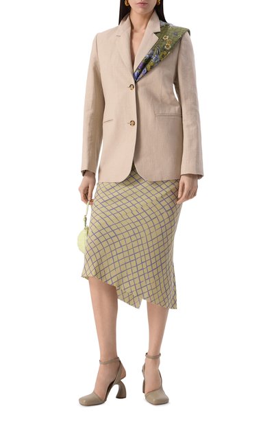 Слингбэки Le Cadeau с кожаной внутренней отделкой выполнили из атласа в мелкий горох. Туфли с удлиненным зауженным мысом декорировали объемным двойным бантом на союзке и серебристой эмблемой на подошве.
