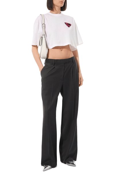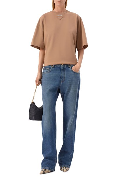 Футболку силуэта oversize выполнили из тонкого джерси на основе лиоцелла с добавлением хлопка и шелка. Спереди модель с круглой горловиной украсили вышивкой с монограммой GA.