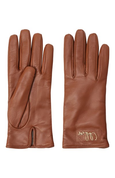 Перчатки с зигзагообразными стежками на манжете украсили логотипом, нанесенным методом термопечати. Аксессуар с шелковым подкладом выполнили из зернистой наппы.