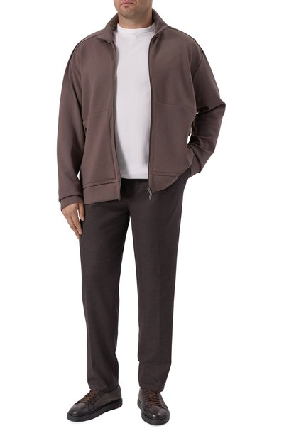 Зауженные брюки со стрелками и отворотами сшиты из шерстяного трикотажа с добавлением кашемира. Модель дополнена двумя открытыми карманами и парой на молниях.