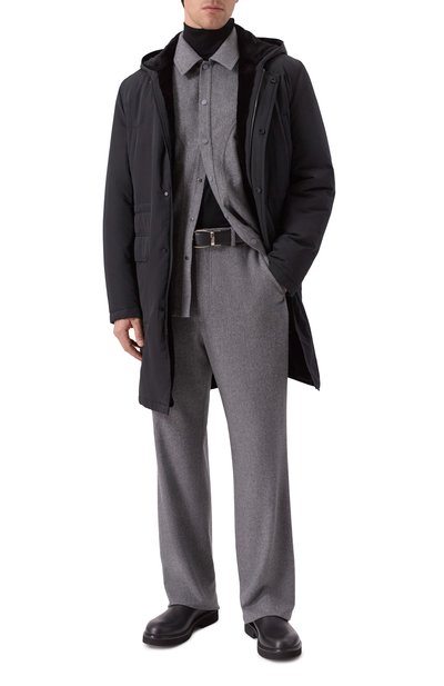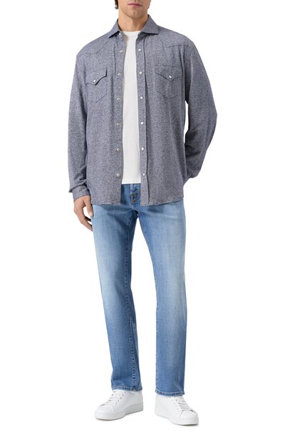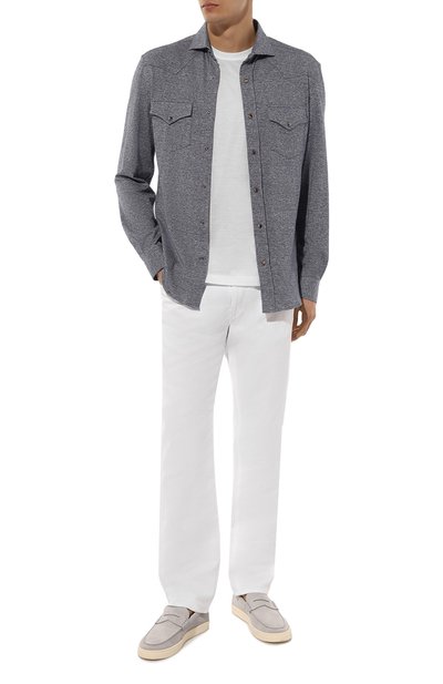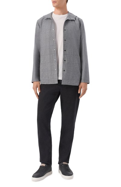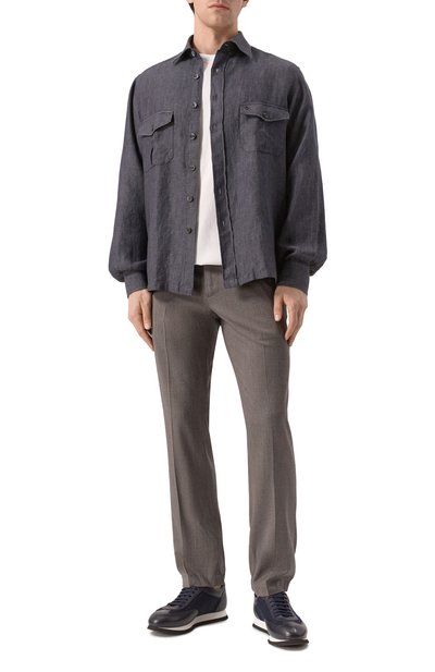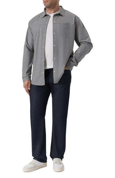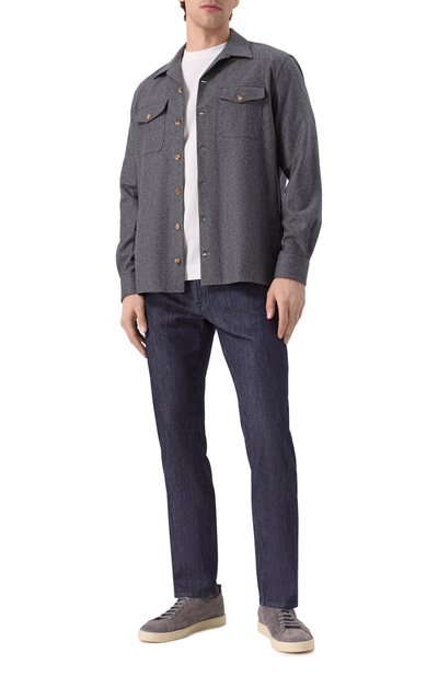 Рубашку Zeus со скошенными манжетами и фигурным низом сшили из эластичного кашемира. Модель с нагрудными карманами застегивается кнопками с фирменной эмблемой в виде маски Пульчинеллы.